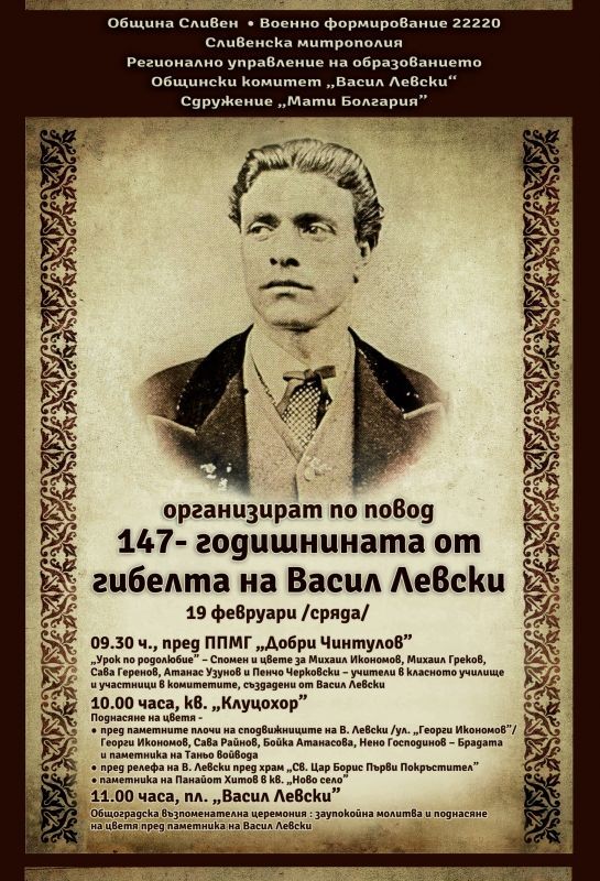Община Сливен, Военно формирование 22220, Сливенска митрополия, Регионално управление на образованието, Общински комитет „Васил Левски“ и Сдружение „Мати Болгария” канят жителите на Сливен и гостите на града на проявите, посветени на 147-годишнината от гибелта на Васил Левски. Събитията ще се състоят в сряда, 19 февруари.