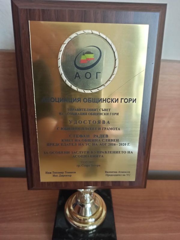 Асоциация „Общински гори“ удостои кмета на Сливен Стефан Радев с юбилеен плакет и грамота за особени заслуги в управлението на асоциацията. Наградата му бе връчена лично от изпълнителния директор инж. Тихомир Томанов. Стефан Радев беше председател на организацията в мандат 2016-2020 г.