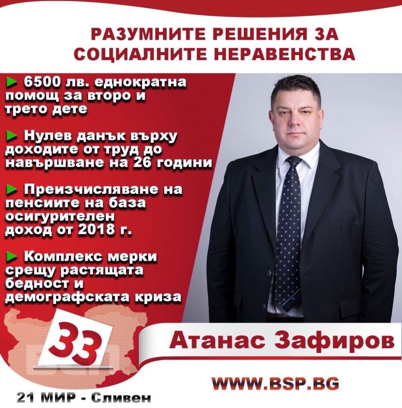 Водачът на листата с кандидати за народни представители на „БСП за България“ в Сливен Атанас Зафиров заяви, че са необходими спешни мерки срещу намаляване на растящата бедност и демографската криза в българското общество.