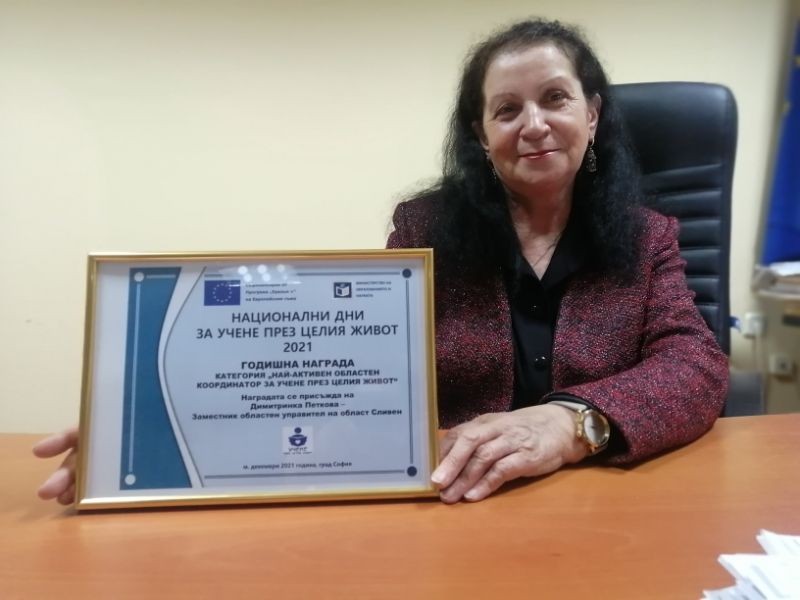 В категорията „Най-активен областен координатор за учене през целия живот“ наградата бе присъдена на зам.областния управител на Сливен Димитринка Петкова.