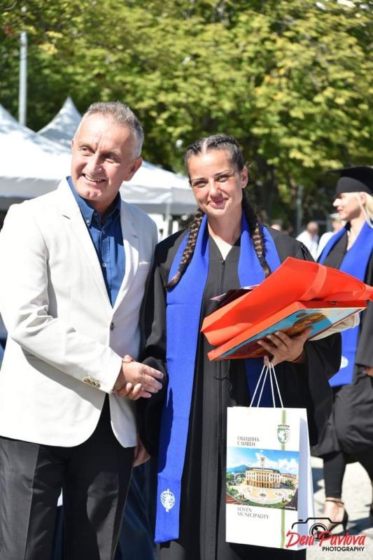 „Днес Сливен има още един повод за гордост! Уважаема Десислава, адмирации и най-добри пожелания по пътя на живота! Нека той бъде изпълнен с много радост, щастие и реализация на всичките ти планове! Дерзай и надграждай постигнатото! Честито дипломиране и на добър час!“, пише в поздравителния адрес на кмета Радев. В него той още изтъква забележителната история, дългогодишните традиции и устои на училището. „Вярвам, че всеки студент, който е бил негов възпитаник, е изпитвал гордост и почитание, получавайки солидна образователна подготовка. На всички студенти пожелавам здраве, успешно кариерно развитие и да сбъднат мечтите си!“, завършва кметът. От негово име бе връчена възпоменателна сребърна монета на Стария бряст в Сливен на началника на флотската Алма матер - флотилен адмирал проф. д.в.н. Боян Медникаров.