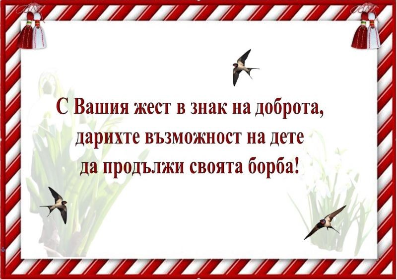 По първи март Нова Загора се обедини около поредната благородна кауза. Началото беше поставено от Община Нова Загора с организирането на работилничка за мартеници на 26 февруари, в която се включиха децата и колективите на детските градини „Слънчице“, „Тракийче“, „Надежда“, „Бодра смяна“ и „Детски свят“ и Център за обществена подкрепа в гр. Нова Загора. Богатата колекция от изработени красиви изделия беше подредена на изложба-базар пред Спортна зала „Младост“ и предизвика интереса на новозагорци в дните преди първи март. За атрактивното изживяване допринесоха и самодейците от НЧ „Христо Ботев – 1920“ с. Млекарево – Баба Марта и нейният усмихнат помощник от Туристически център Нова Загора. Съпричастни към идеята се оказаха много граждани. Благотворителната кутия беше поставена и при честването на Националния празник на Република България на 3 март. Общинското ръководство изказва сърдечна благодарност на всички благотворители. В резултат на общата щедра спомоществователност бяха събрани 5035 лв. за лечението на Боян Калайджиев от с. Млекарево. С мартеници българите се закичват за здраве, те сплотиха жителите на нашата община и за да подкрепят оздравяването и да дадат надежда на едно единадесетгодишно дете.